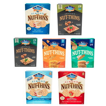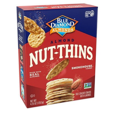 Blue Diamond Natural Almond Nut Thins. Blue Diamond Natural Almond Nut Thins. A gluten-free delicious nut and rice cracker Nut Thins pack 3 grams of protein and only 130 calories for 16 crackers.